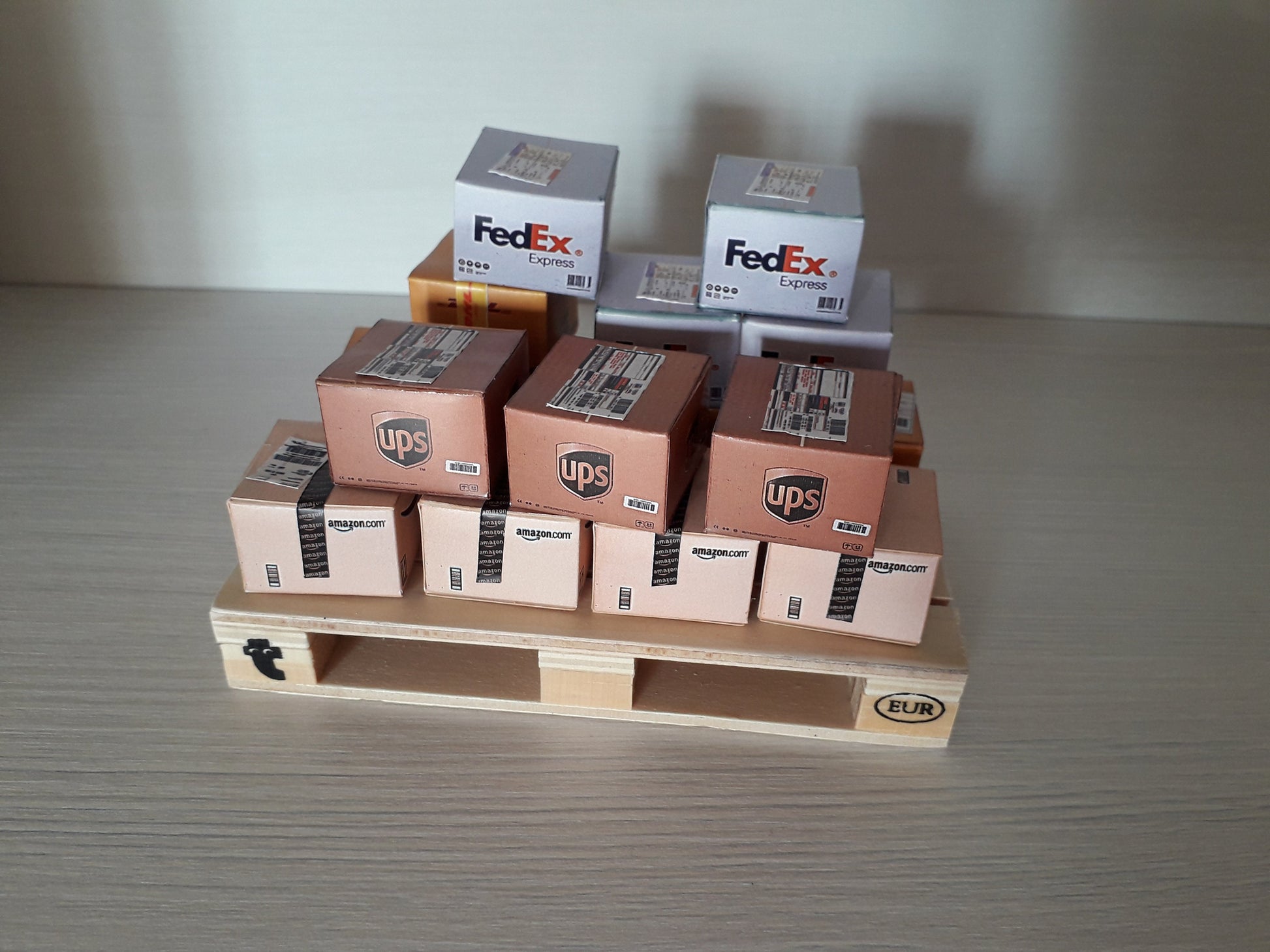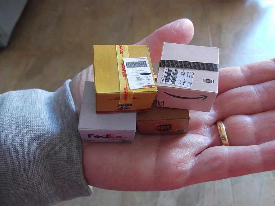 Miniature Shipping boxes. Scales (1:12, 1;6). DHL, Amazon, Fedex, UPS, Seur, Vente Privee ...